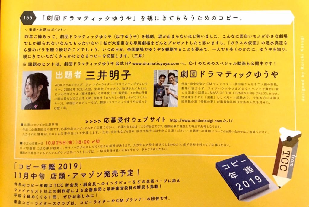 この度、東京コピーライターズクラブ(TCC)様と月刊「ブレーン」様がタッグを組み、コピーの可能性を引き出すために立ち上げた企画、「C-1グランプリ」に劇団ドラマティックゆうやの紙面公演決定でございます!