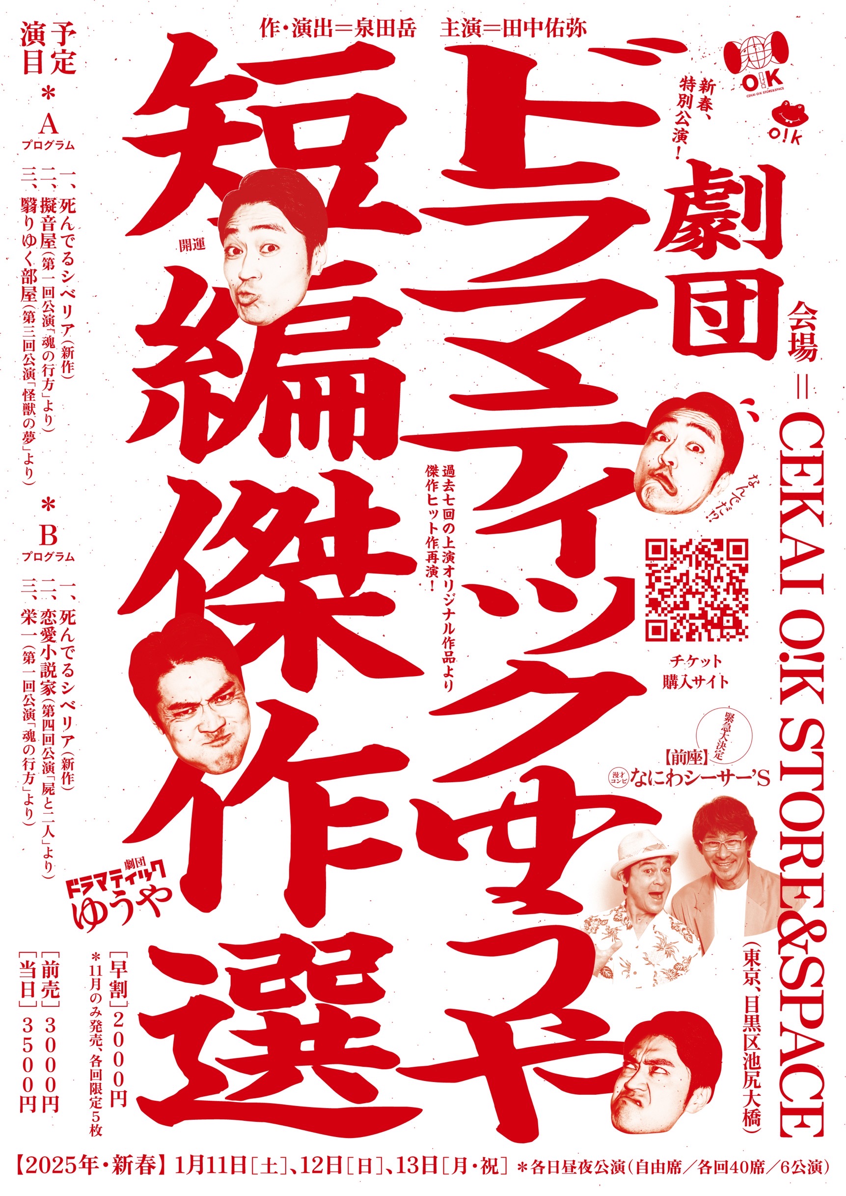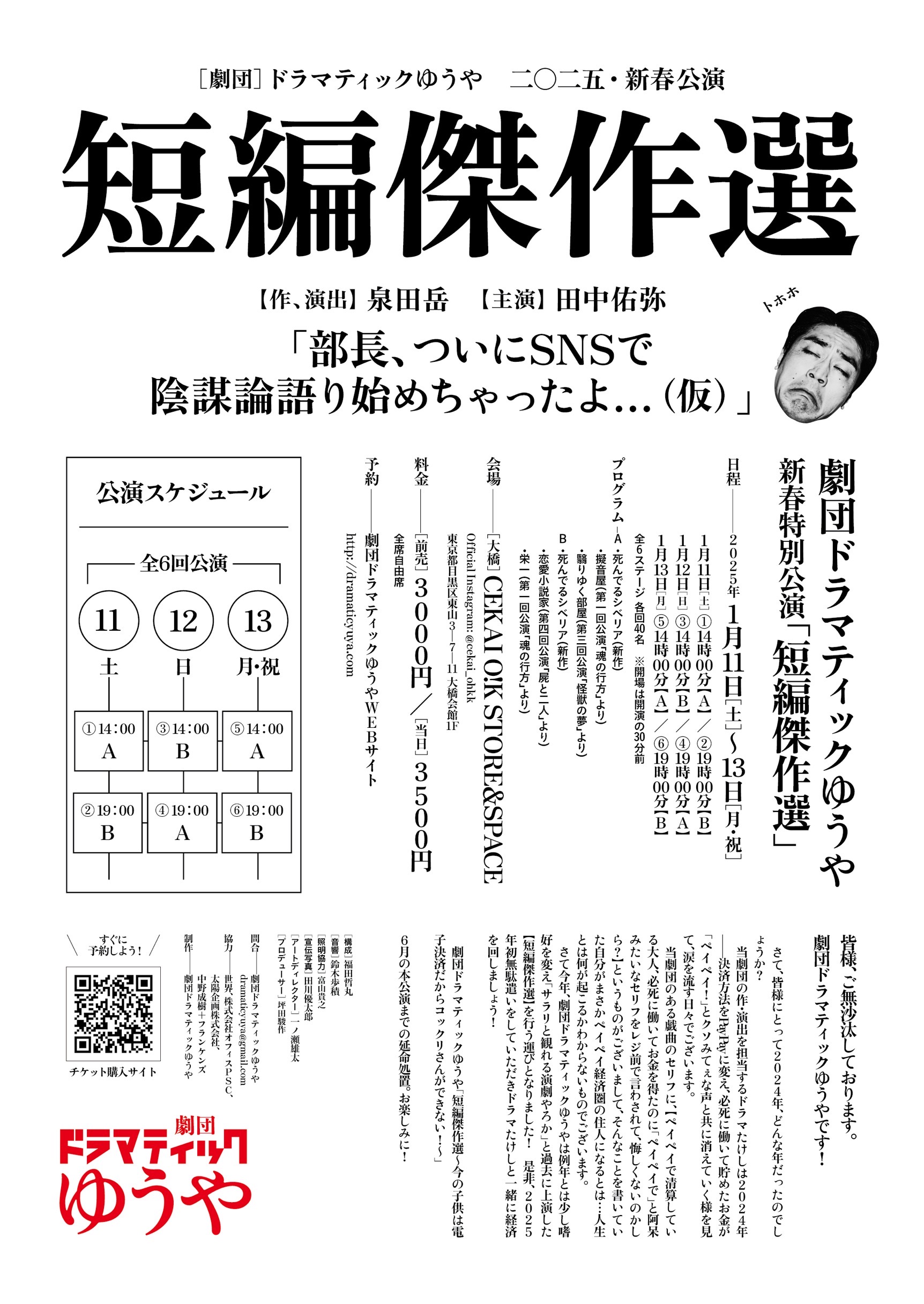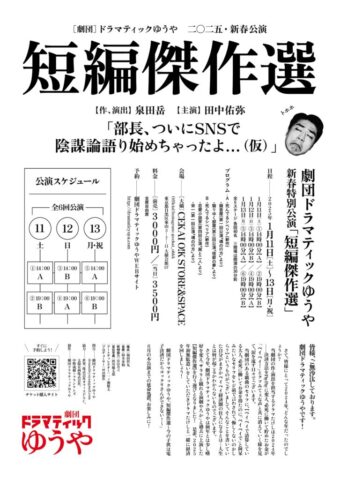 さて今年、劇団ドラマティックゆうやは例年とは少し嗜好を変え「サラリと観れる演劇やろか」と過去に上演した【短編傑作選】を行う運びとなりました!是非、2025年初無駄遣いをしていただきドラマたけしと一緒に経済を回しましょう!
